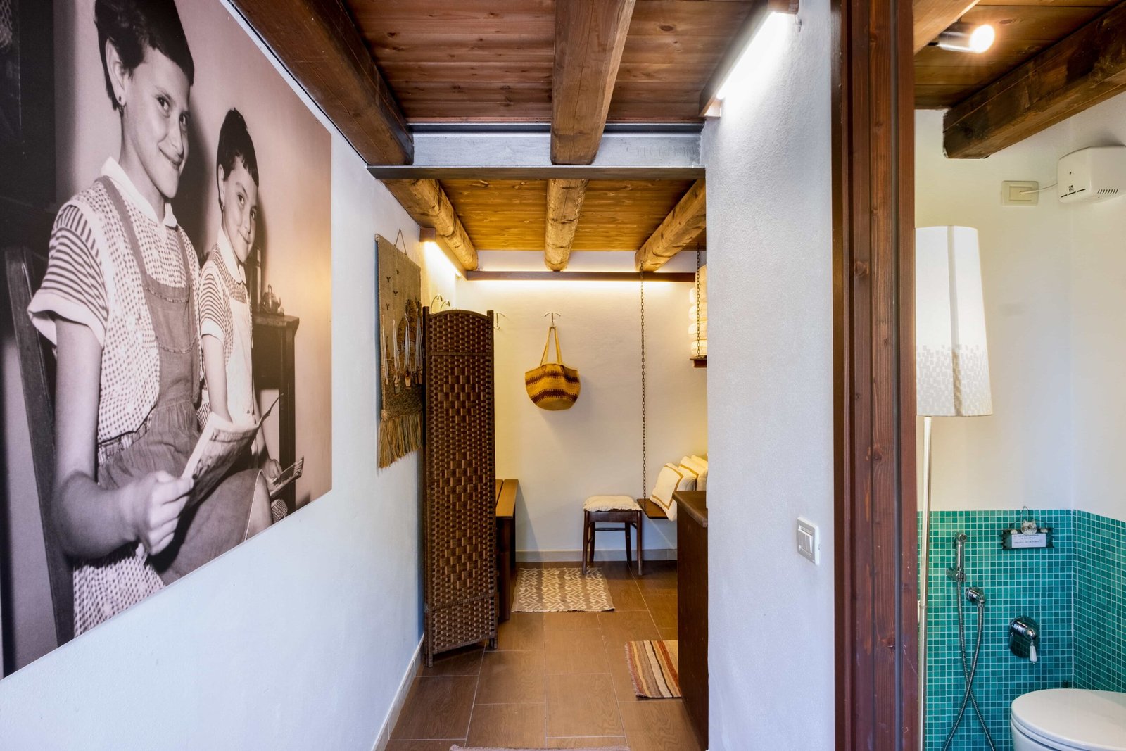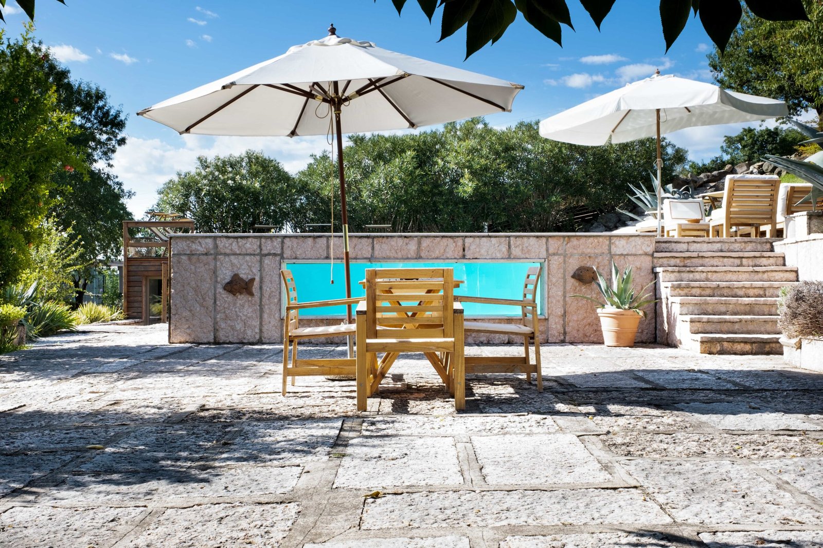 Un vasto piazzale pavimentato in pietra accoglie comodi arredi in midollino, eleganti poltrone e divani, invitando al relax. Un’ampia gamma di posti a sedere, tra cui sdraio e poltrone sotto un ombrellone, offre comfort e piacere all’aria aperta. Il tutto è arricchito da un porticato di legno, che offre un comodo riparo da sole e giornate uggiose permettendo di godere dell’aria esterna